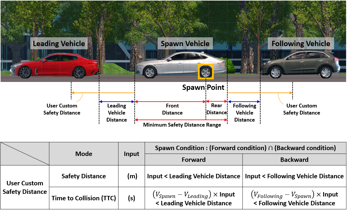 If the current velocity of the Leading Vehicle is faster than the spawn velocity of the Spawn Vehicle, the User Custom Safety Distance value is applied as 0.