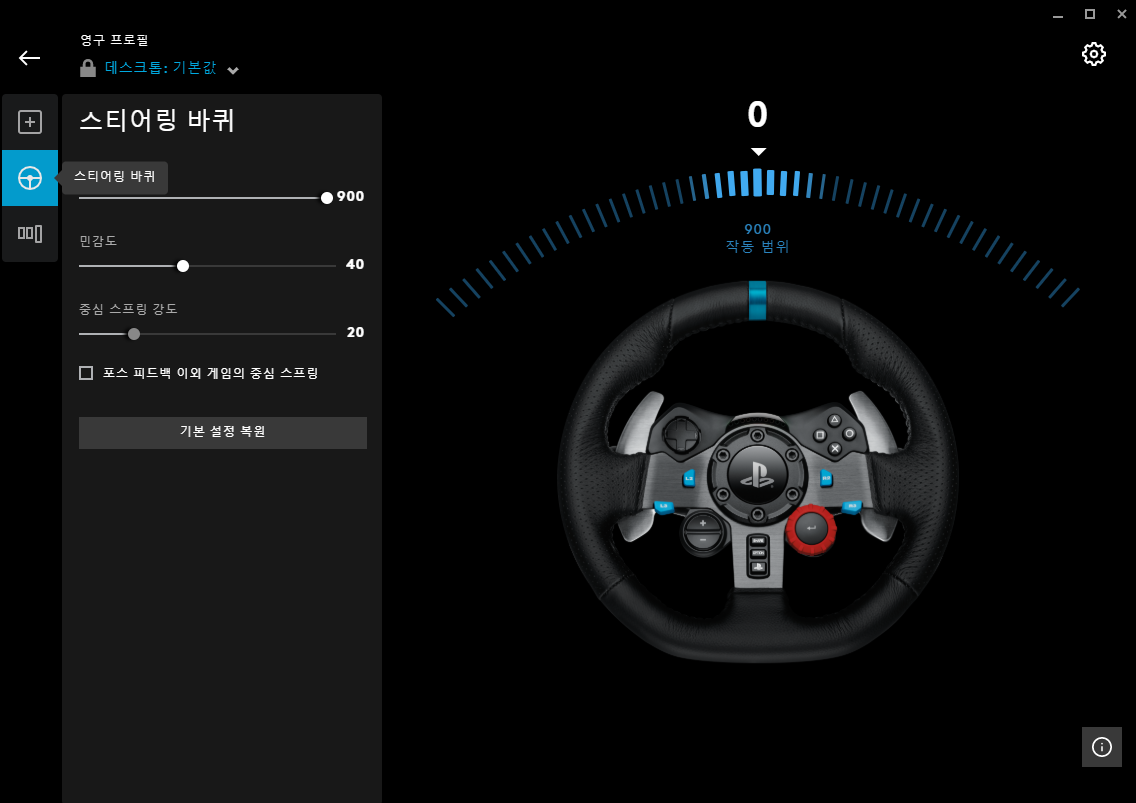 2] Adjust the steering wheel's operating range and sensitivity in the Steering Wheel menu on the left side of the G HUB screen.