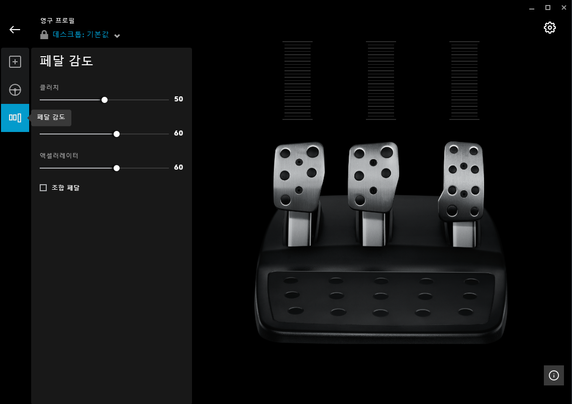 Adjust the clutch, brake, and accelerator in the Pedal Sensitivity menu on the left side of the G HUB screen.