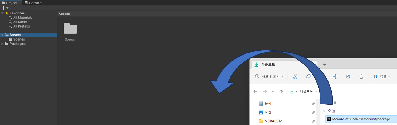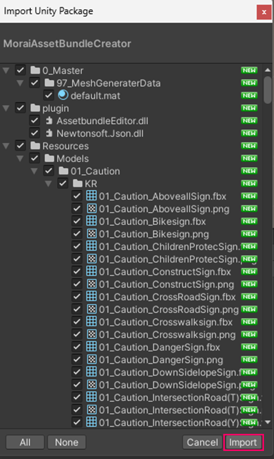 In the Import Unity Package window that pops up, check the MoraiAssetBundleCreator package file and click Import at the bottom.