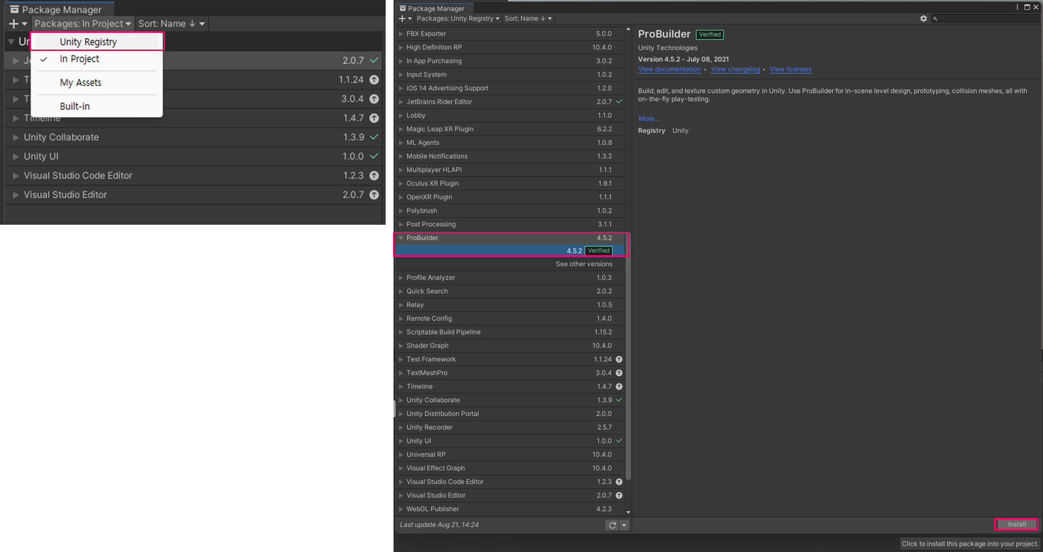 In the Package Manager window, change the Packages option to Unity Registry and click Install the ProBuilder 4.5.2 where it is detected.