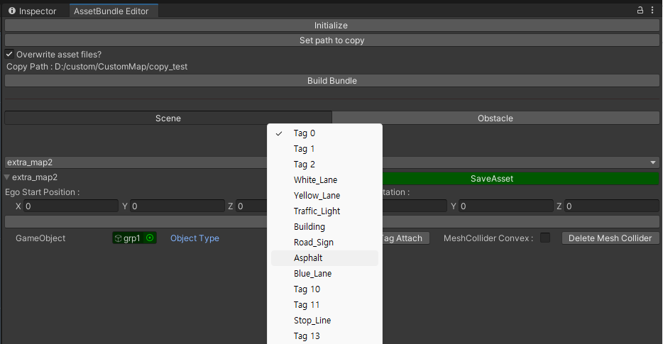 4, Click the Tag0 drop-down list of GameObject to select a tag value that corresponds to the material of the road mesh (.obj) you added.