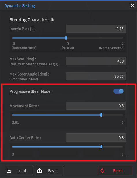 Detailed settings for the Movement Rate and Auto Center Rate variables in Progressive Steer Mode are available when using the MORAI Advanced Vehicle Dynamics Add-on.