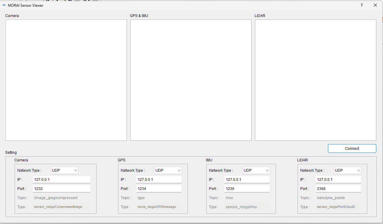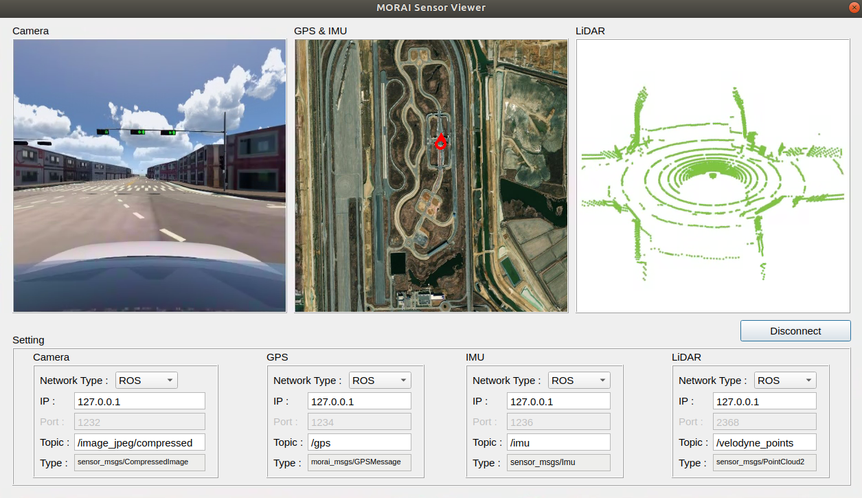 This example uses MORAI SIM’s ROS network features and associated UI to connect to a sample visualizer.