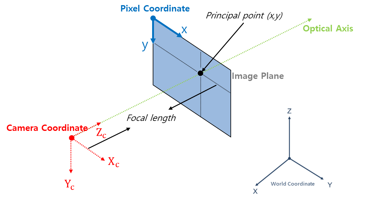 The camera coordinate system for one point is defined as follows, with the axis in the direction the camera faces, referred to as the Optical Axis, and represented by the coordinates (x, y, z).