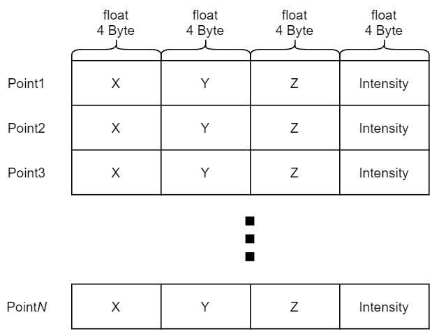 binfile contains 4-byte values for each point, with the x, y, z coordinates and intensity stored sequentially without spaces. The origin of the point cloud is the position where the LiDAR is mounted.