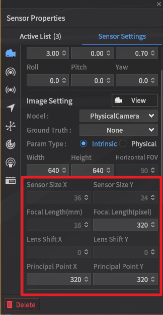 In the IMU sensor, parameter values that represent the characteristics of the sensor, such as the Camera's Width, Height, and GT type, cannot be modified.