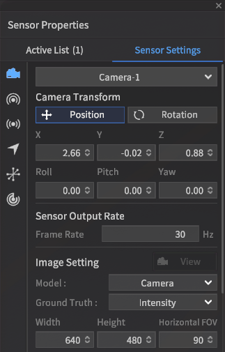 Configure the camera's X, Y, Z (based on the vehicle axes), Roll, Pitch, Yaw, resolution, FOV, and ground truth output.