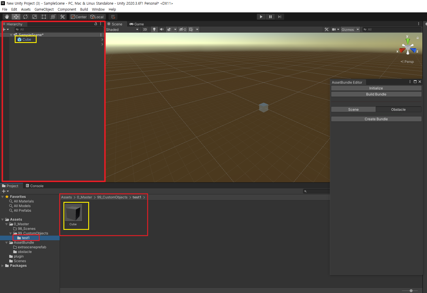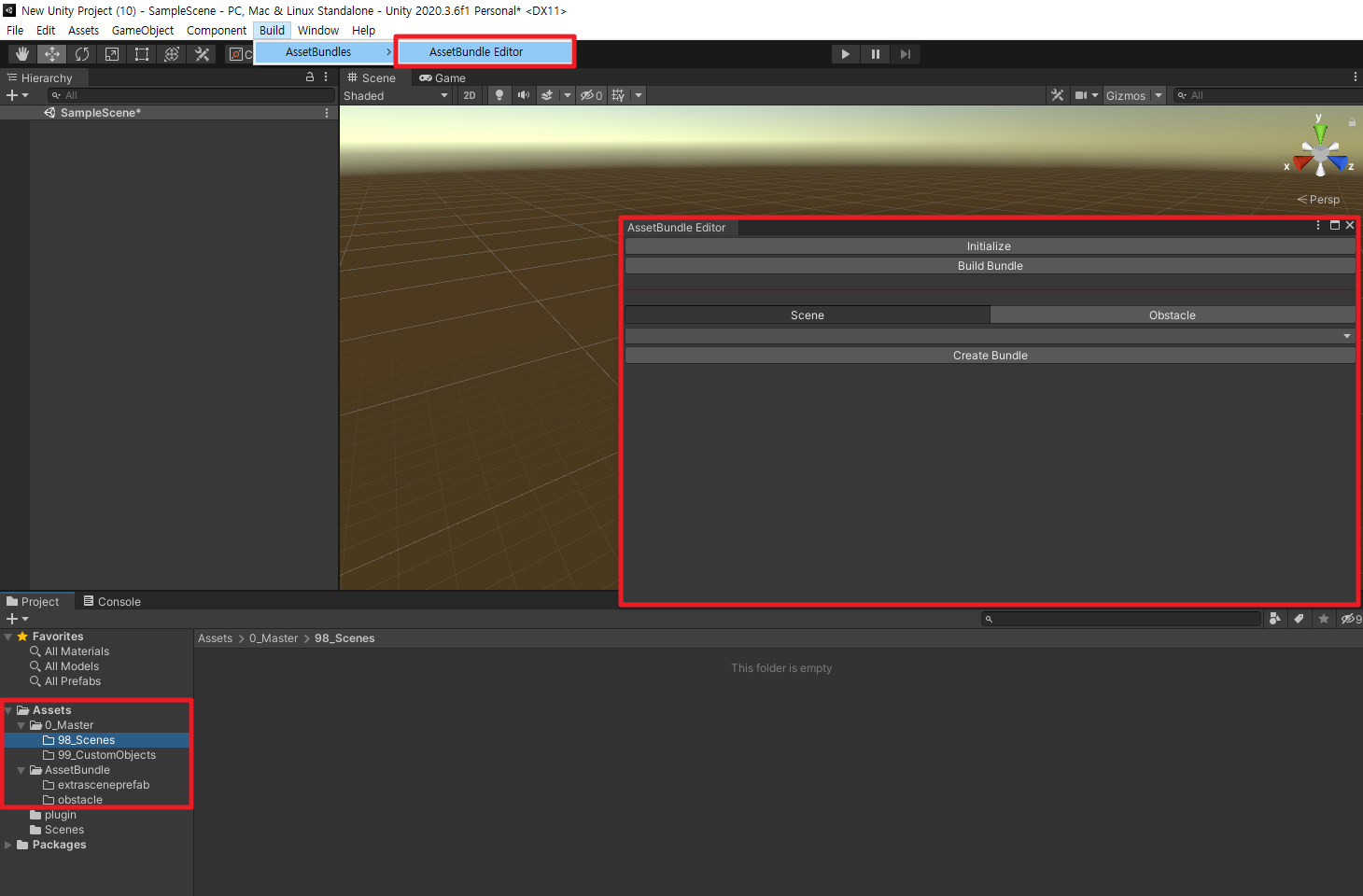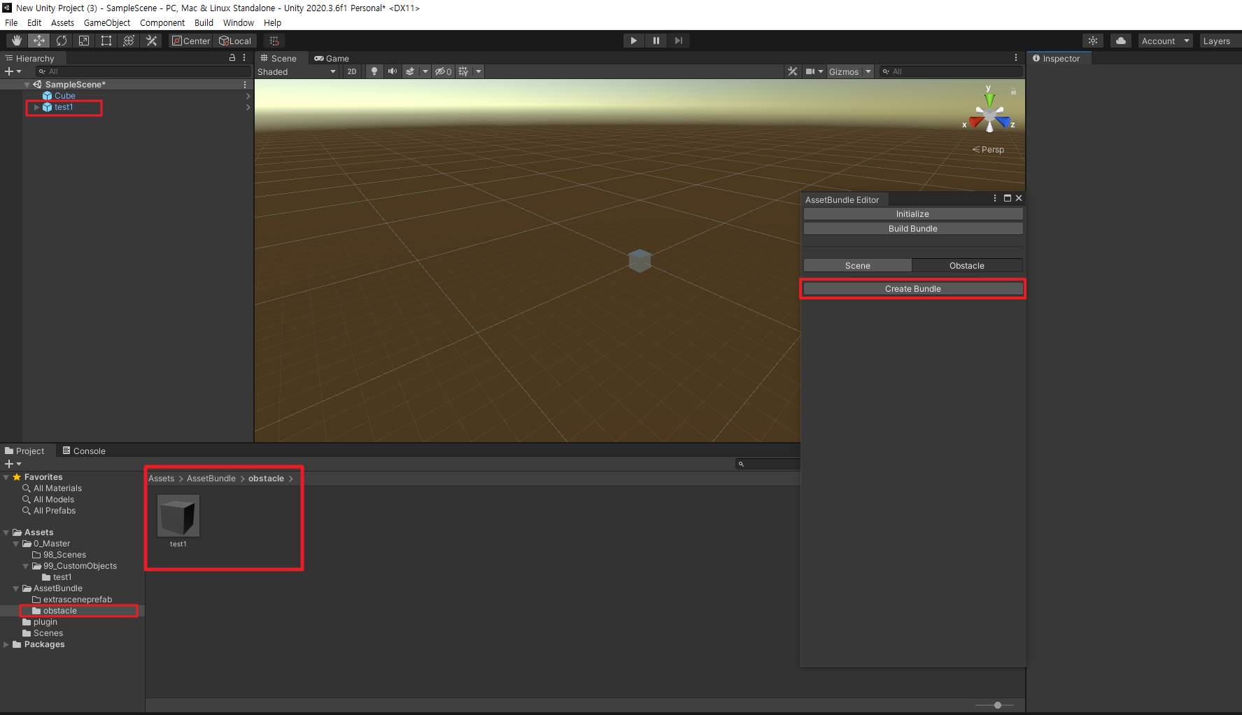 Go to Build > AssetBundles > AssetBundle Editor, then click 1) Initialize tab and 2) Obstacle tab, and 3) Create Bundle button.