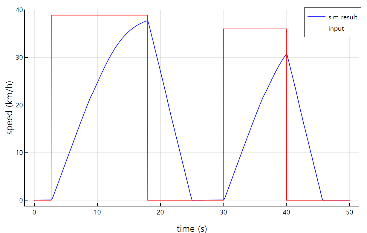 The longitudinal speed control method was changed to an acceleration control method. This implementation limits acceleration to 1 m/s² for speed increases and -2 m/s² for speed decreases, preventing sudden changes in speed that could lead to chattering. As a result, although the reaction time to discontinuous speed inputs is slower, the system now converges more stably to the target speed, as illustrated in the figure below.